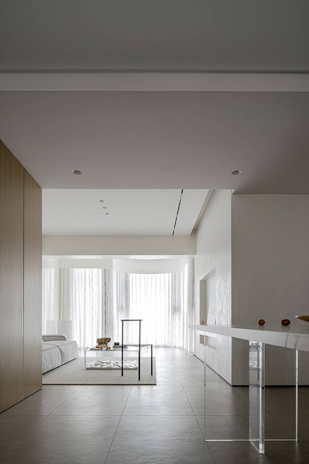 玻璃与布艺两种材质平衡了稳重与轻盈两种特质。但尽管如此,空间也通过色彩的极尽浅淡而不显得厚重。