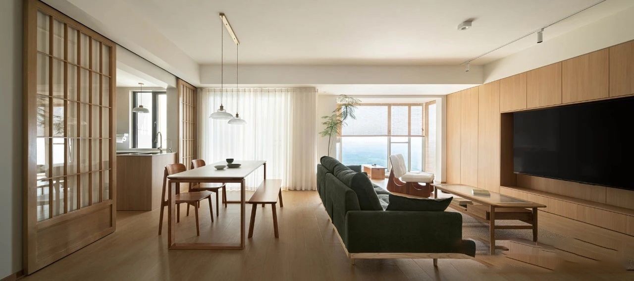 左侧打造客餐厅一体开放式格局,40楼,将景观阳台纳入室内,与客厅一体,在窗边远眺,如身处云端,视野开阔;将原精装地板和墙全部拆除,替换为舒适温暖的木质,打造平和惬意的氛围
