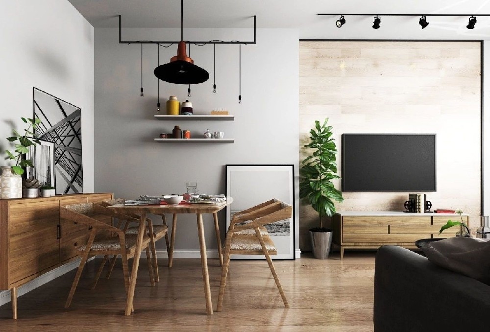 电视背景墙与餐厅区域采用木 地板上墙作为背景墙的设计 在不吊顶的情况下 轨道灯是相对实用的补充照明光源。