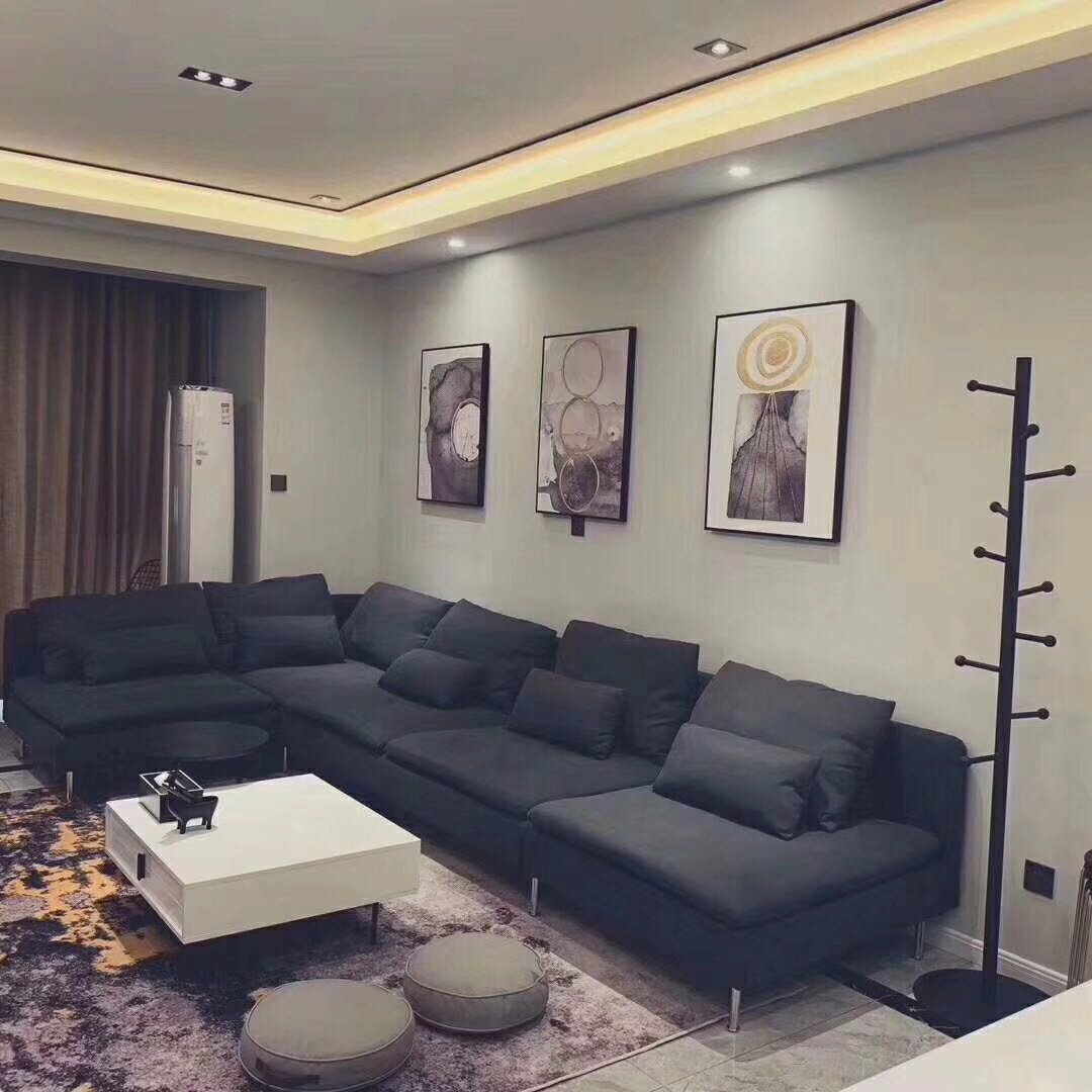 客厅采用了深色带妃的转角沙发,背景墙搭配亮色挂画