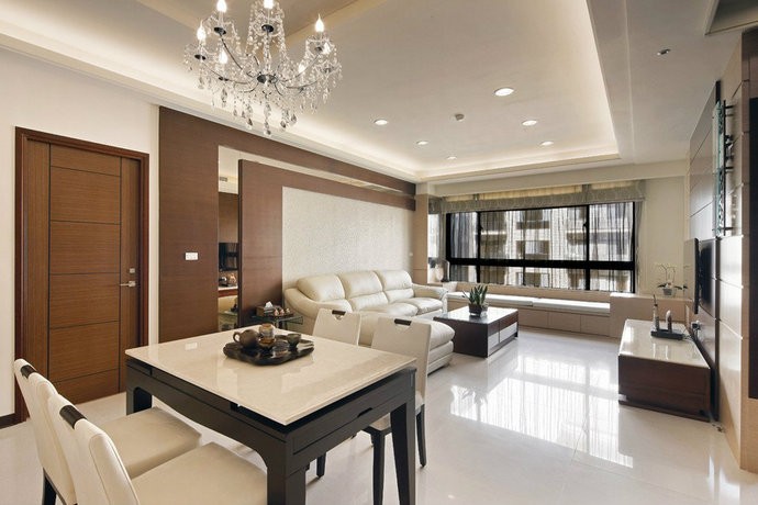 业主是一对从事家电行业的年轻夫妻,要求整体空间明亮整洁,客厅的地面采用了大面积的白色亮光瓷砖,整体色调是白色和棕色的搭配,既明亮又突显稳重。家具的选择和墙面装饰的色系统一和谐,略微繁复的装饰吊灯为整体简明的吊顶布局增添趣味。