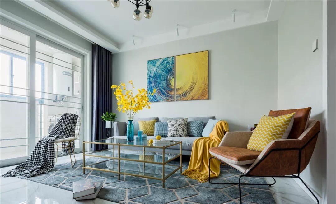 灰色沙发以及深灰色不规则图案的地毯,与墙面同一个色系,简洁大方。搭配跳色的黄色抱枕,个性的装饰画,金色的玻璃茶几,再配上几支亮黄色的跳舞兰,蓝色的玻璃瓶,整体的色调非常完美的融合在一起。与家人一起窝在沙发上追追剧、聊聊天,简直是一种享受~