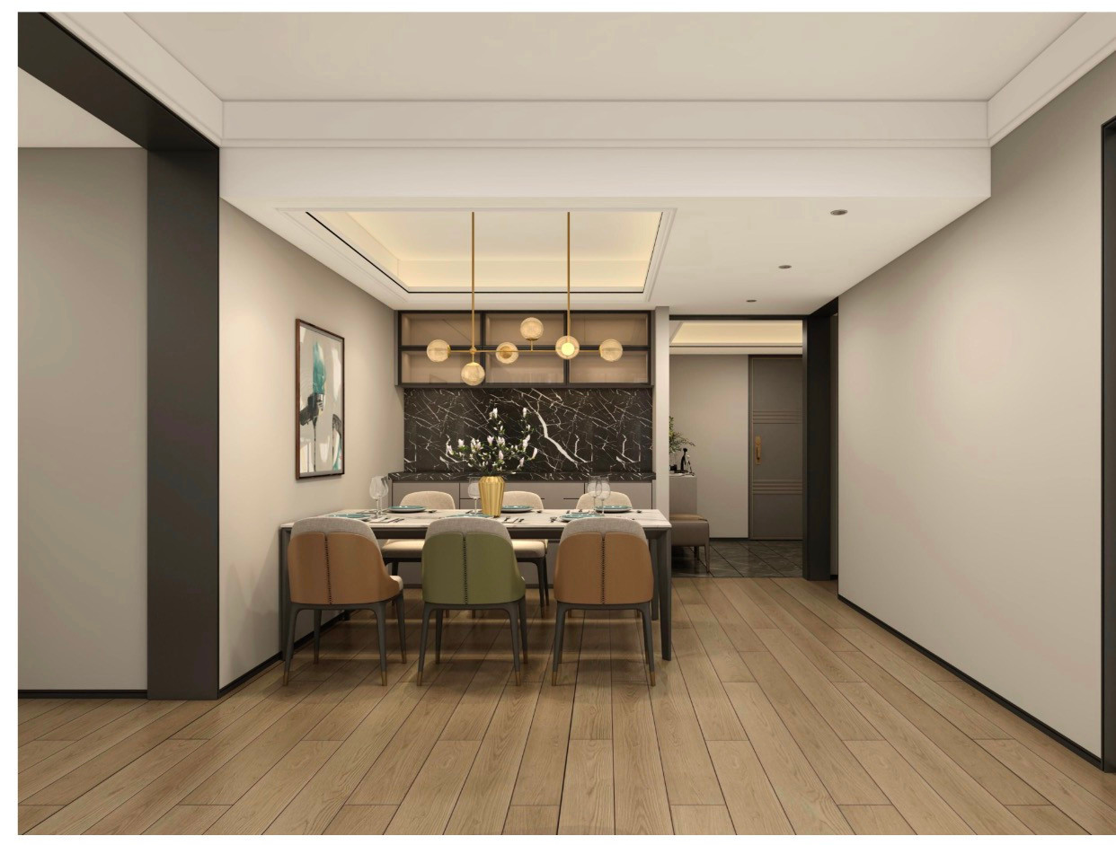 餐厅与客厅相连,方形餐桌搭配精美吊灯,简约大方。