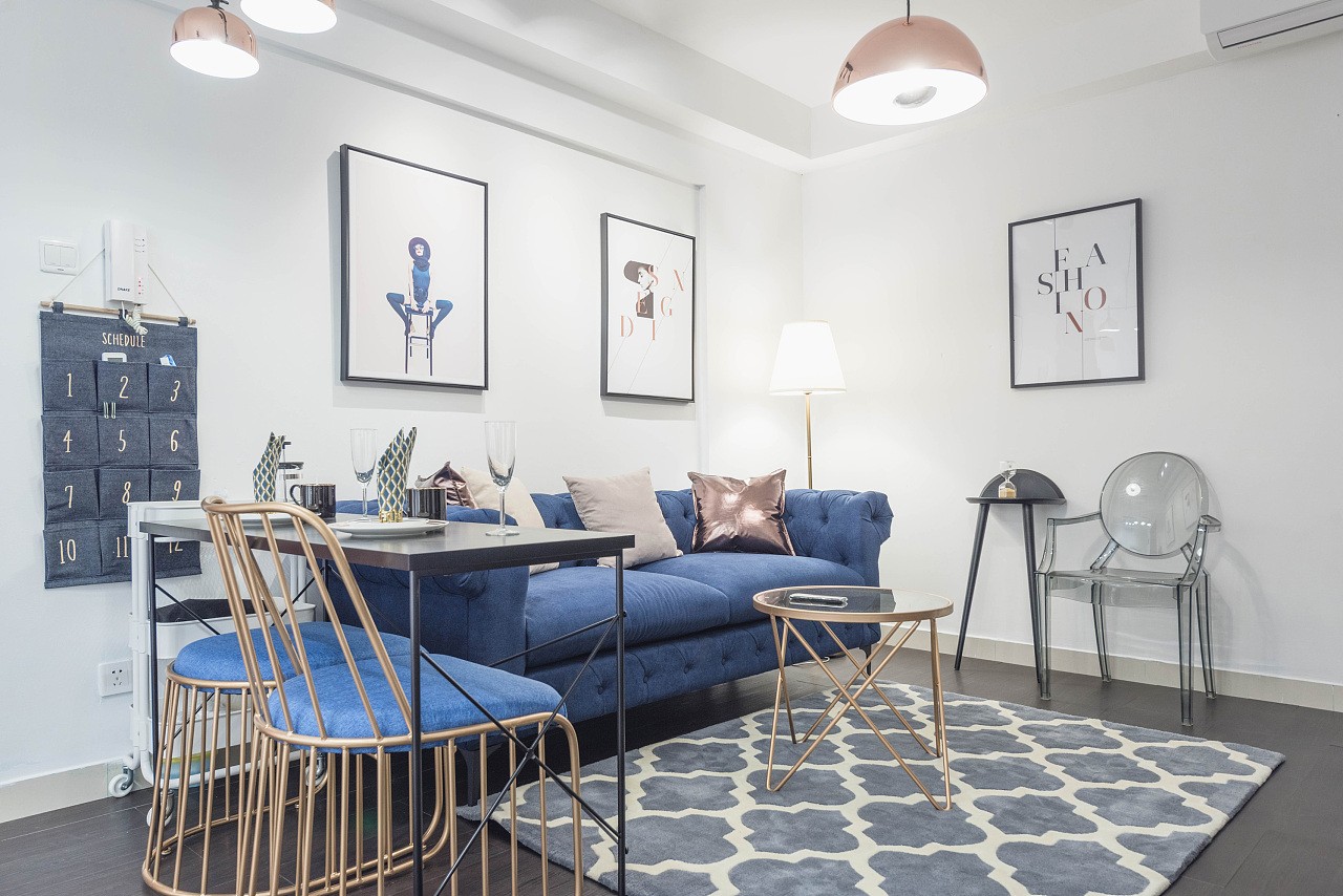 一进门,我们就被客厅处的设计惊艳了,客厅处实用不说,蓝色为整个空间装饰加分不少。