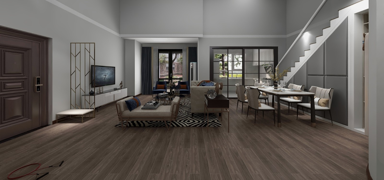 餐厅背景设计为木质展示柜,其在楼梯下方,不仅起到装饰的作用,又增加了收纳功能。