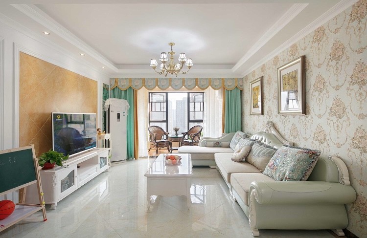 客厅选用的花色墙纸和窗帘相呼应,餐厅墙面做了大量储物柜,满足功能需求