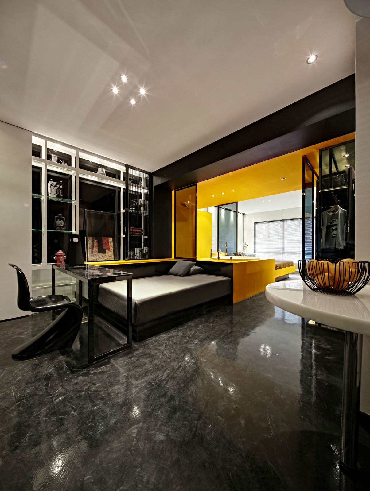 黑白橙的三色系搭配,使得整个空间立体感十足,公寓造型层高较高,没有使用主灯,采用了全部的暗藏筒灯设计,满面的落地窗使得整体空间显得更加空旷