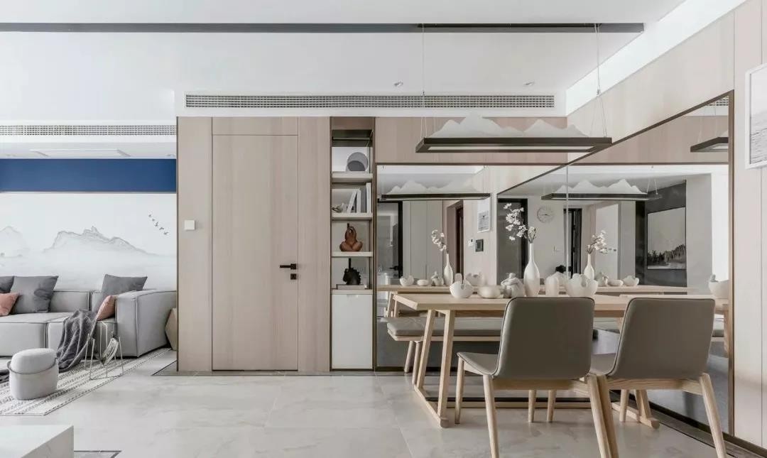 入户右侧规划为餐厅,灰木色系的家具搭配新中式风吊灯,墙面采用镜面材质,拓展视觉空间与层次,吊灯在镜面中虚实相映