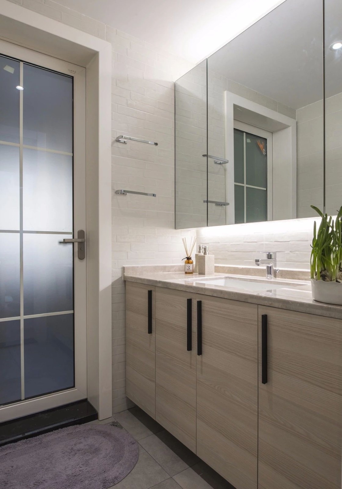 厨房,深色地砖搭配浅色墙砖,木纹橱柜门,整体简单但功能全面