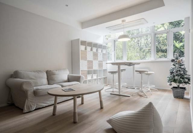 无任何装饰感的电视墙,甚至没有电视机和电视柜,灰色的墙面倍显整洁,在吊顶中藏入了升降投影幕布,平时偶尔利用投影仪也能完美观影。细看吊顶左上角,实则还藏入了新风系统,可以完美净化屋内空间,减少扬尘、浮灰、细菌等,生活简约健康。平时只有三口人居住,极少来客人,父母也都在本地,距离不远串门方便无需留出客房老人房。双人位沙发搭配懒人豆袋完全够用,圆形细腿实木茶几减少磕碰,木色的温润让家中自然气息更强烈。