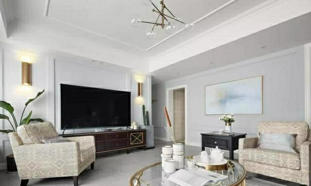 入户门厅,不得不说面积大就是好,整个空间的布局非常完善,比如左侧蓝色护墙板上的挂钩区以及坐凳等等,再加上右侧大面积的储物柜,功能非常强大,沿着门厅进来就是左侧的走廊,由于客厅面积大,就加装了一道蓝色的隔断,如此好处有三,一是沙发有了靠着的地方;二是过道区域可以摆放一台钢琴(靠墙位置);三是入户门正对着客厅,这样设计私密性会更好,电视墙的话,和之前一样,以经典的石膏线为主,不过这里更加注重设计,比如