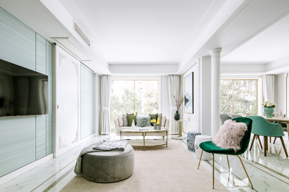 客厅采光通透,整体色感以淡雅色系为主,加以其他亮暗色作为空间的点缀。