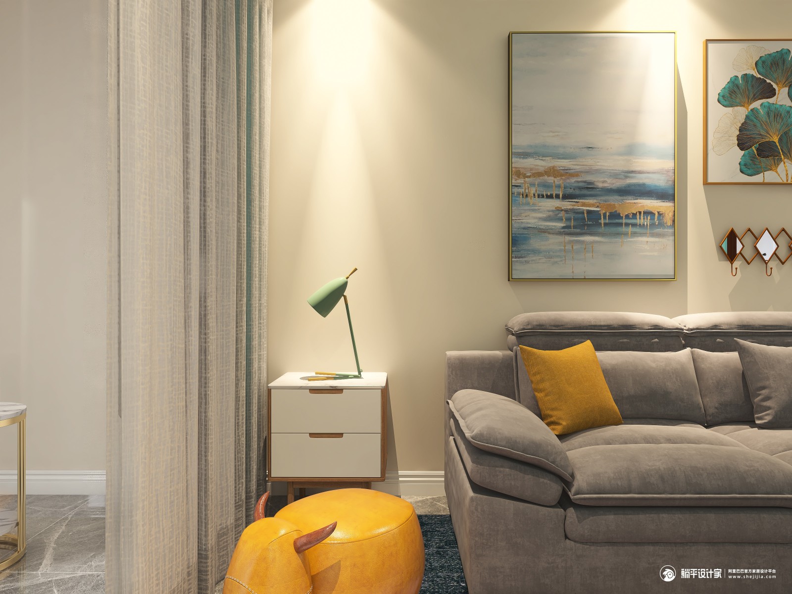 客厅沙发墙面选择了米黄色的温馨元素,搭配灰色布艺沙发,可以再软装上做一些北欧清新色的跳色