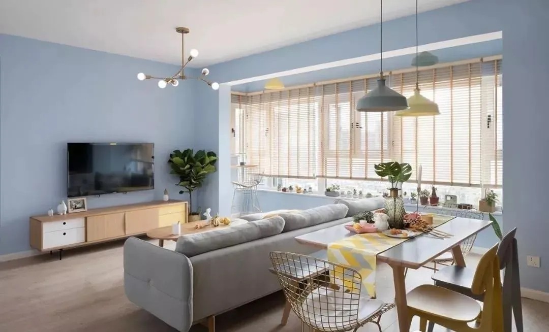 客厅以浅蓝色为主,墙面全刷蓝色乳胶漆,搭配浅棕色木地板,整个空间清爽又舒适。