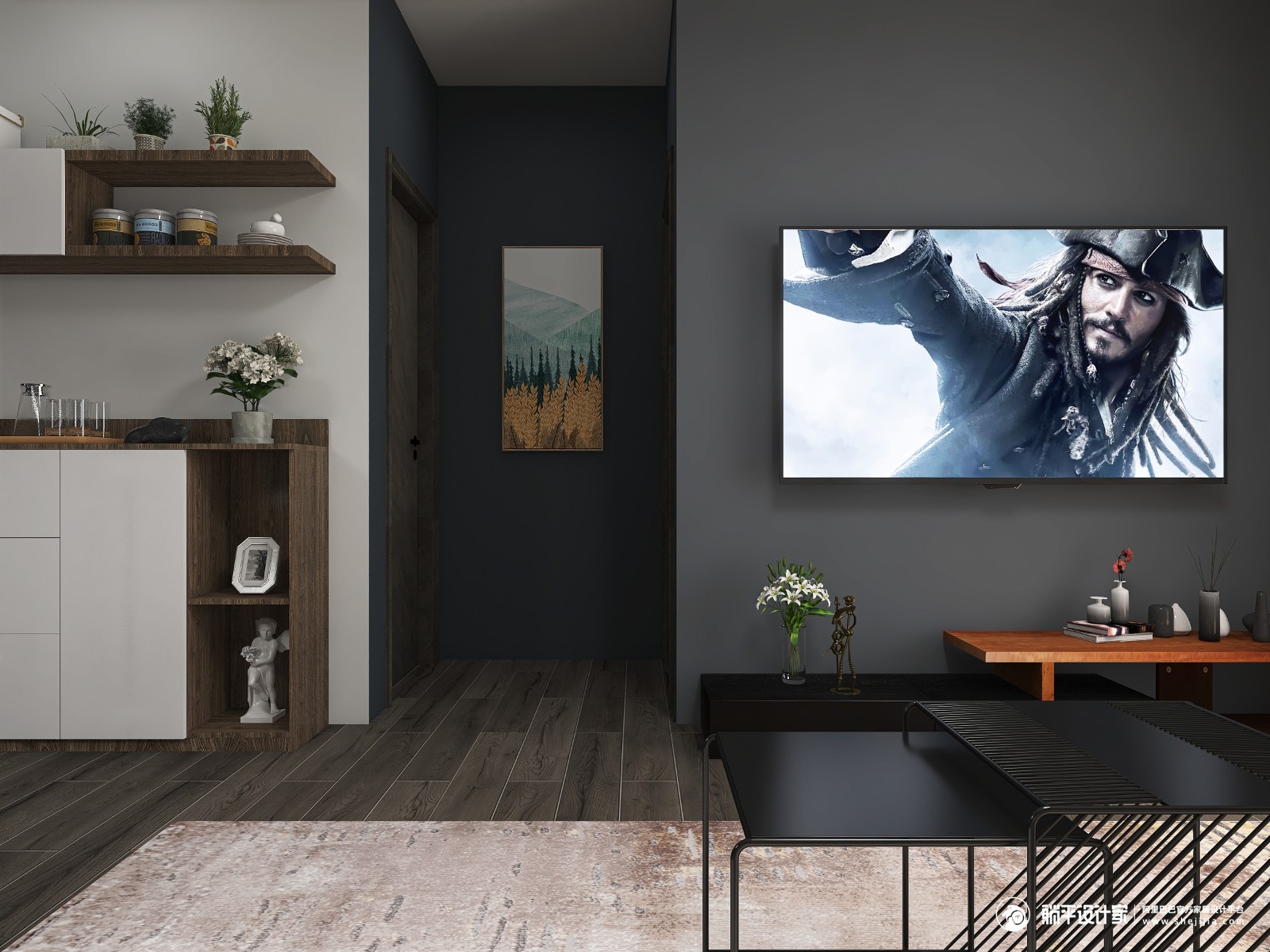 电视柜可以选择比较有质感的,在灰蓝色的衬托下会更有质感
