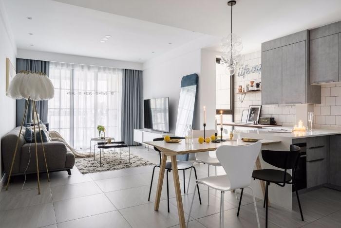餐桌和开放式厨房结合,水泥面效果整体柜现代个性