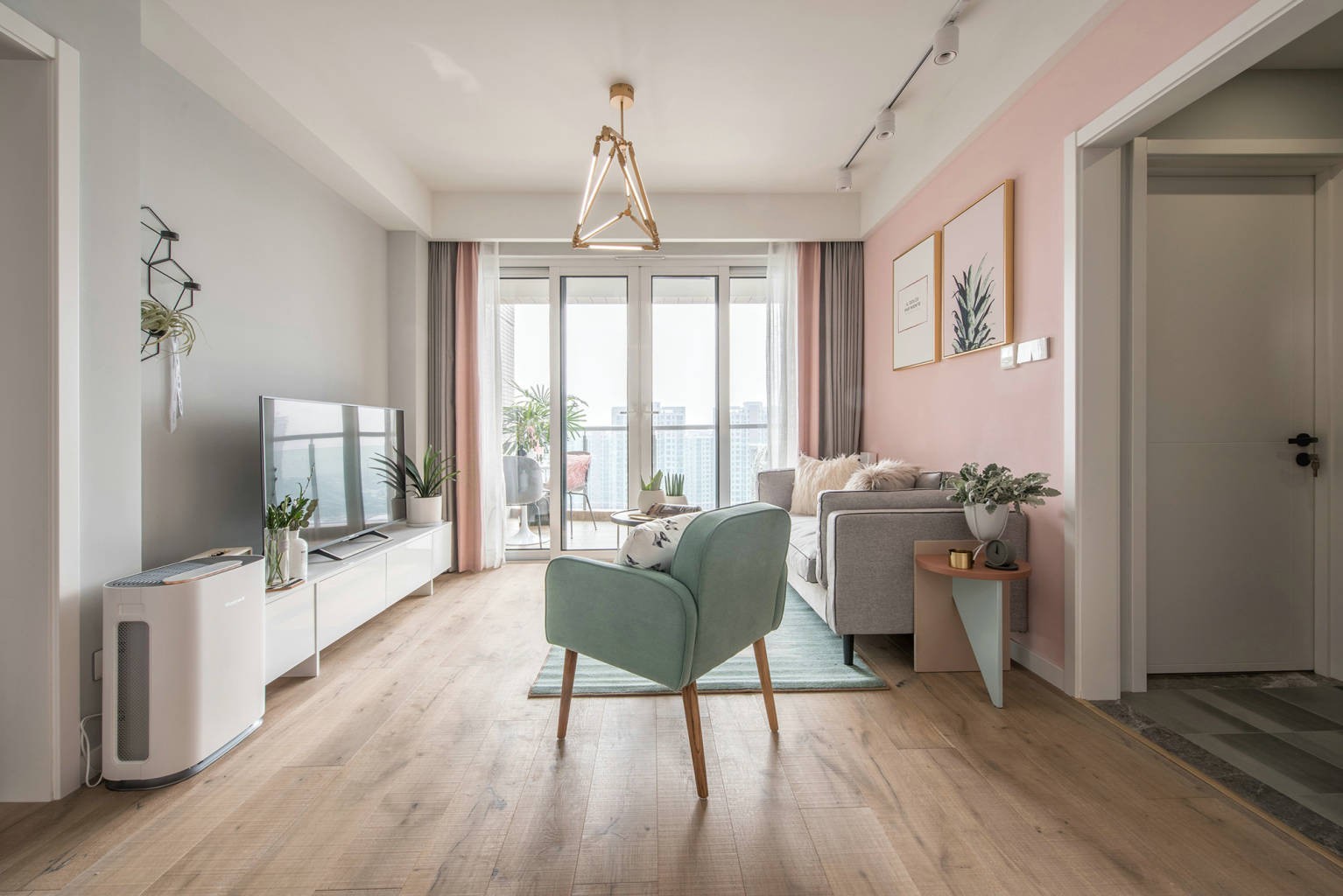 客餐厅采用粉色和浅灰撞色地砖采用木纹且配上大小阳台形成一个活泼时尚而不失大气的客餐厅。