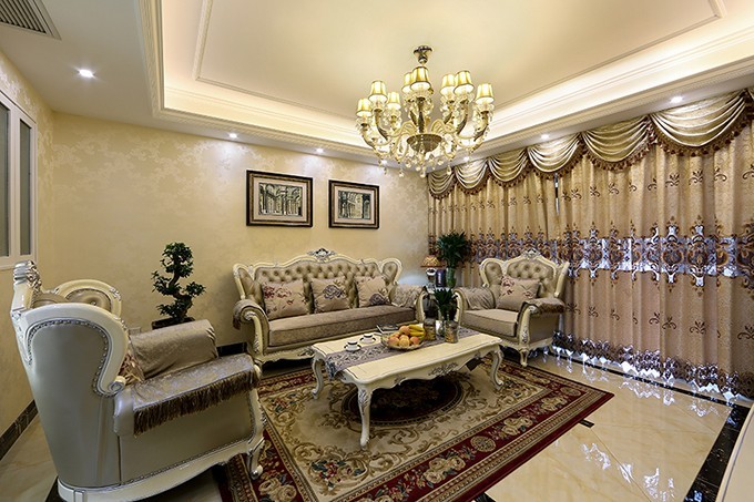 客厅以与背景色相仿的米色布艺来搭配,背景的护墙板和地毯、沙发都互相呈了一个整体,看起来十分协调。