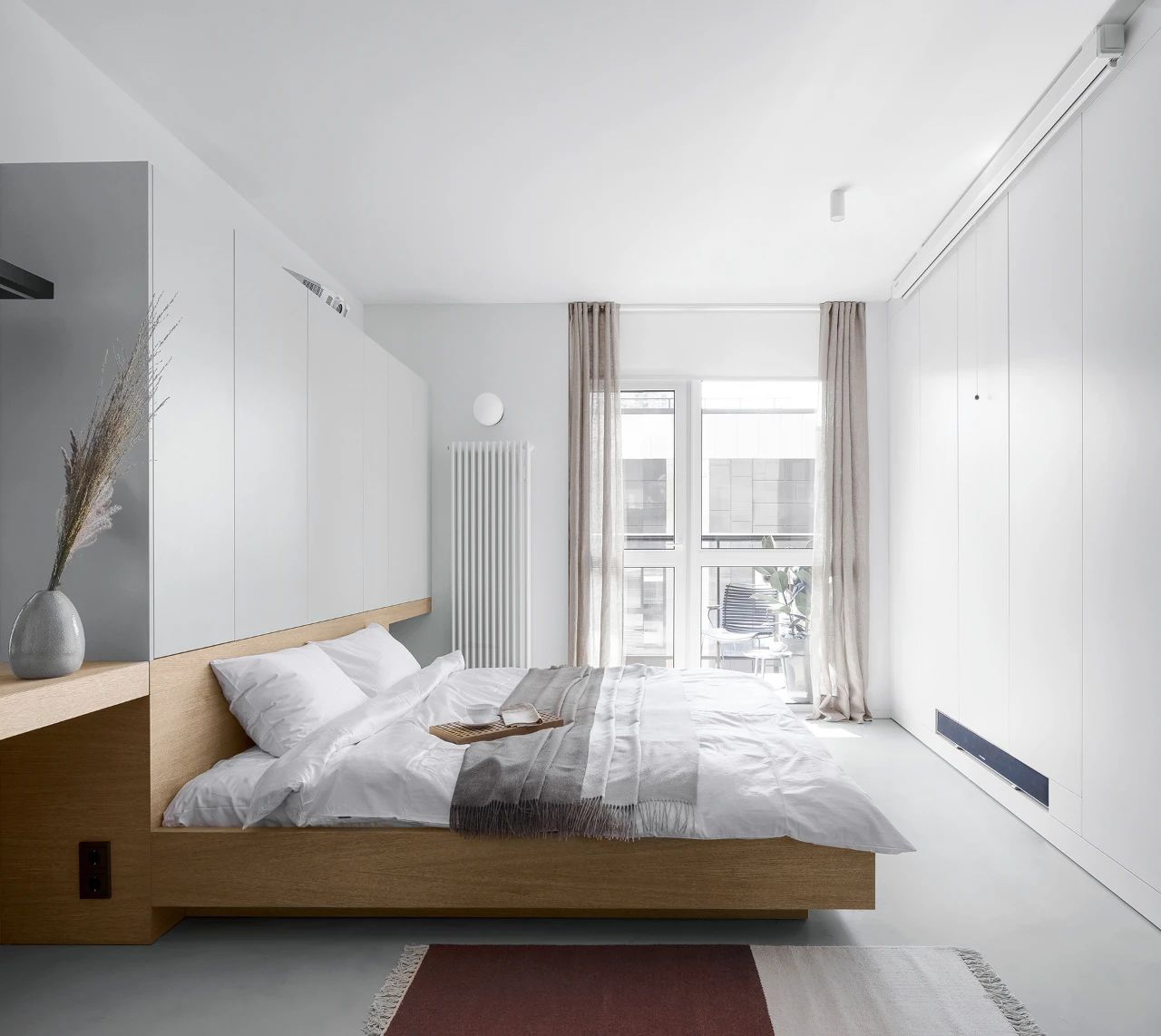 房屋呈一字型,细长的格局很容易造成视线上的拥挤感,所以设计师的规划是,将功能区在两侧展开,留下中央动线,保证光线的穿透。