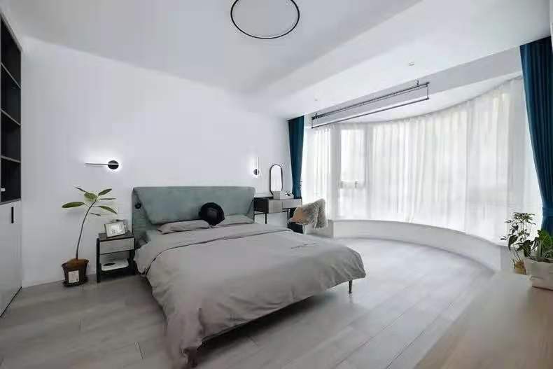 主卧超大款空间,还有依靠户型设计出来的弧形观景窗,空间超明亮,而且素雅设计更有韵味,让整体呈现出一种柔和婉约感。