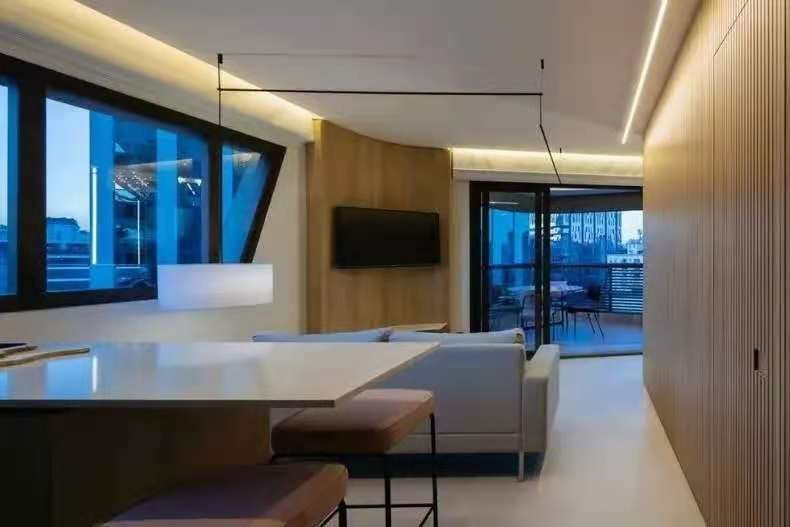 客厅一侧是卧室,多段照明设计,体现出卧室的温馨与安静,使条木更显温润。