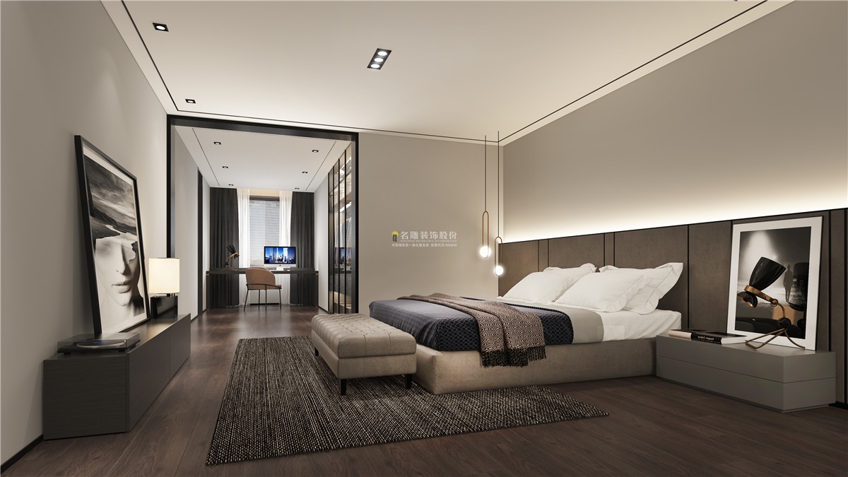 延续公共区域的基调,以***灰的床品和蓝色硬包凸显质感,并利用缥缈的窗帘来增添艺术氛围,利落大气而不失自在轻松。