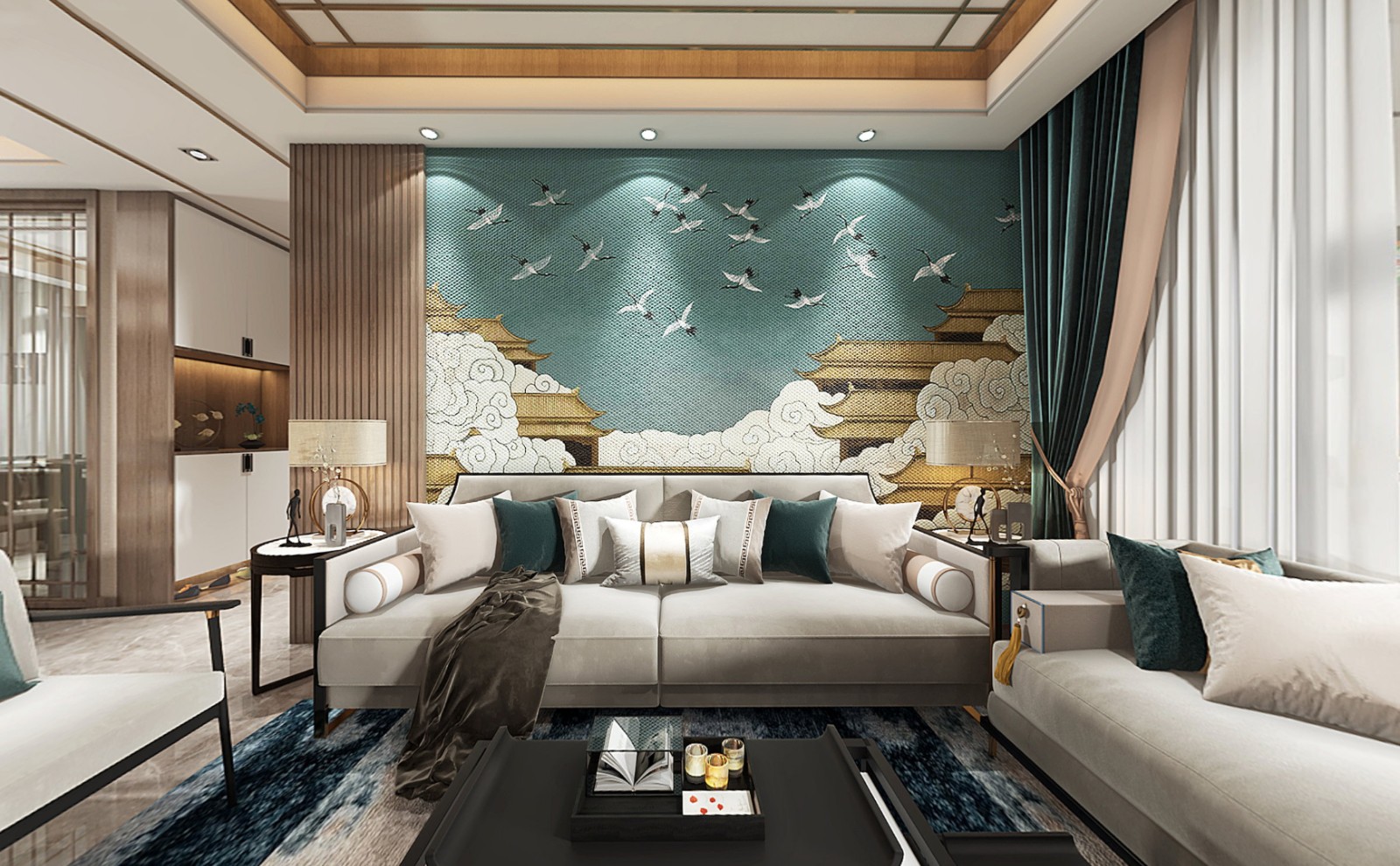 客厅以原木色为主,背景墙是墨绿色,图案精致,恢弘大气,充满古典气息