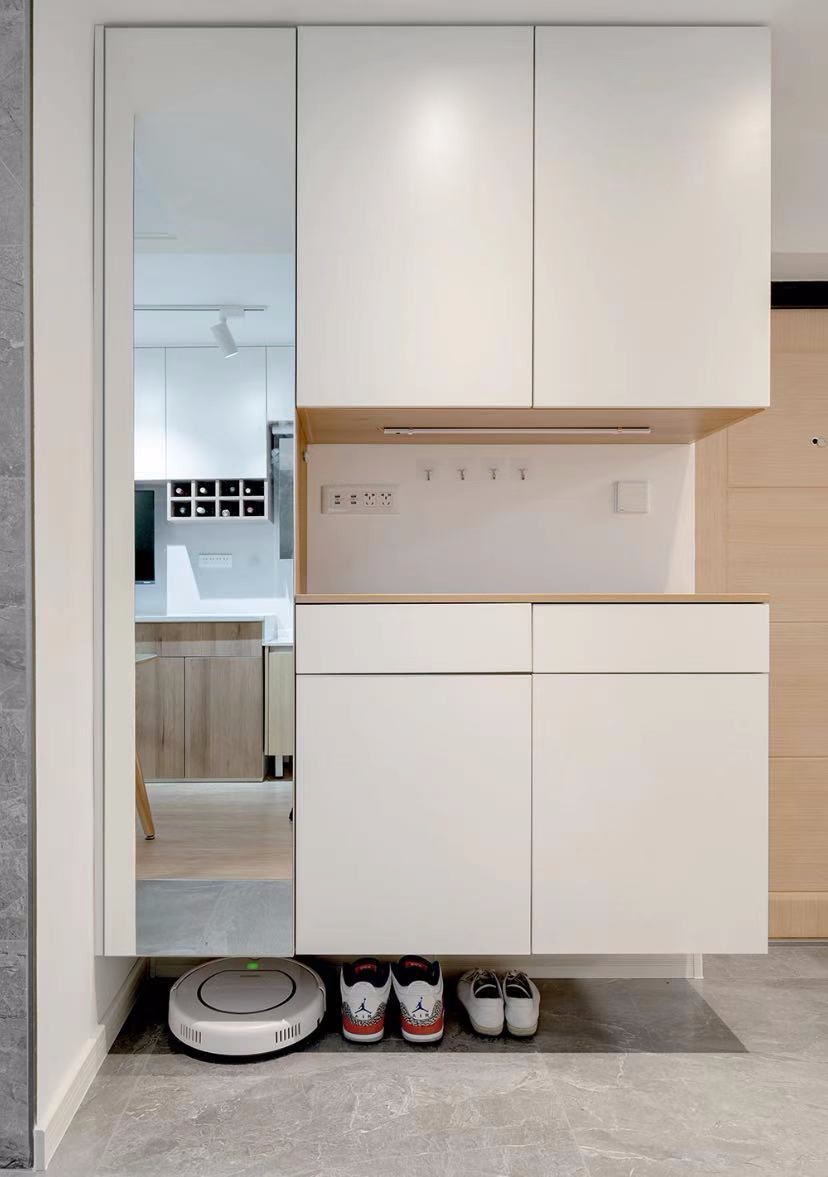 入户门边上做了一组玄关柜,中间留空位置能放些钥匙口罩什么的使用起来很方便。柜子下面留了一截用来放置扫地机器人与鞋。