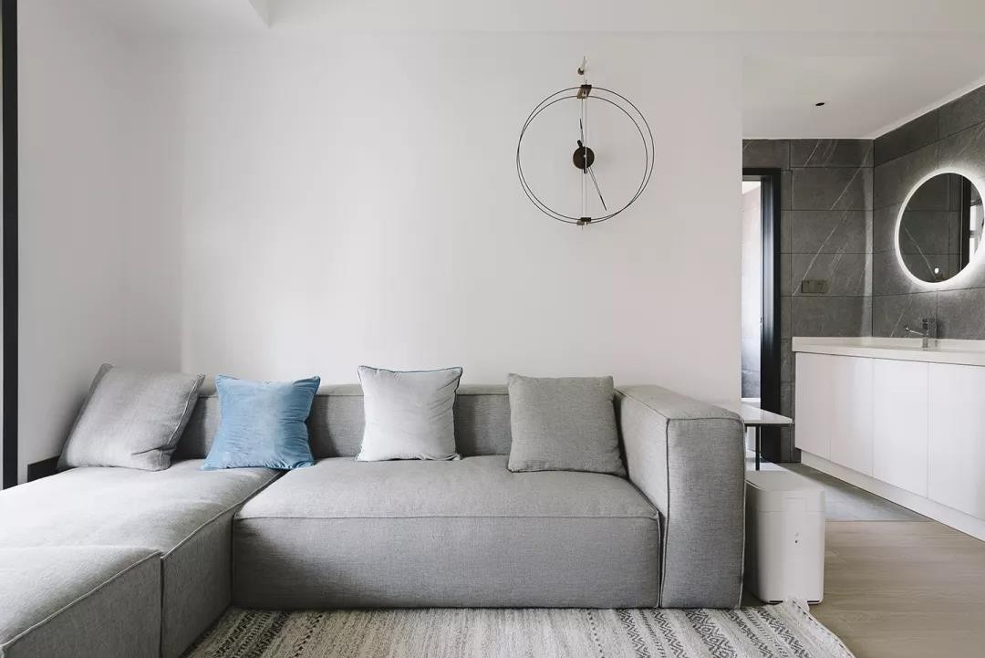 一组灰色布艺沙发,给极简的空间增加了一分温暖的治愈。简约的金属挂钟和边几,点缀得恰到好处。