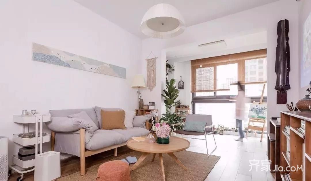 客厅地面通铺原木色地板,留白墙面与极简的线条让空间更加明亮