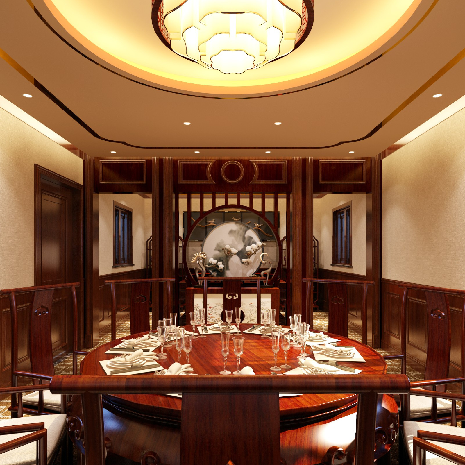10人台 红木原桌 中式木质隔断 中式吊灯