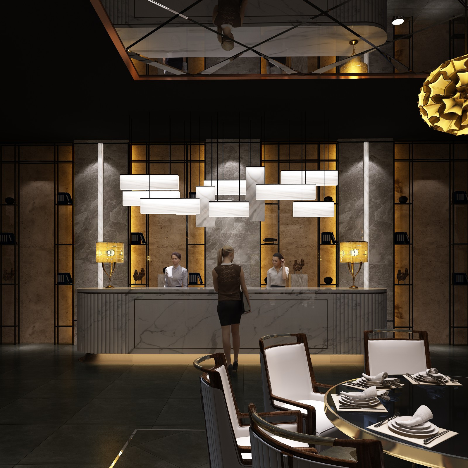 大厅前台 大理石台面 烤漆玻璃 LED