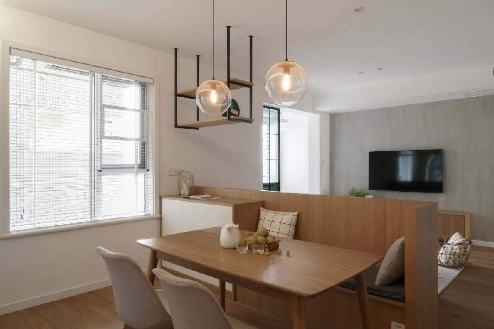 简约的木质餐桌,边角的弧度抹去常见尖角的锋利感,卡座设计也不用担心偶尔来客人时座位不够的局限性。