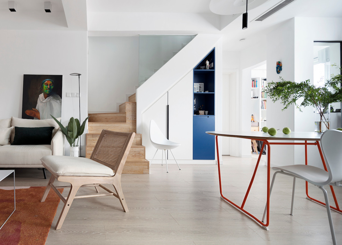柜子的克莱因蓝主题色,而餐桌腿的橙与之对比鲜明
