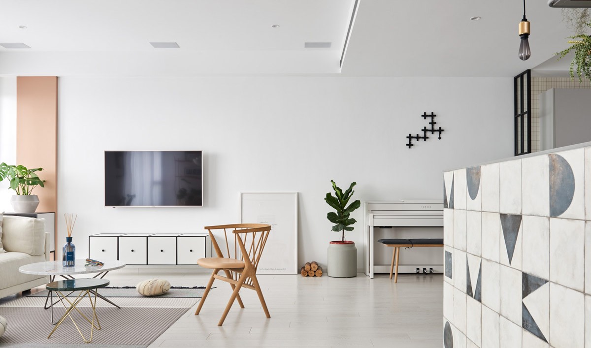 半开放式的厨房,看起来更加像个吧台,墙壁张不同图案的矩形增加房间灵动性。