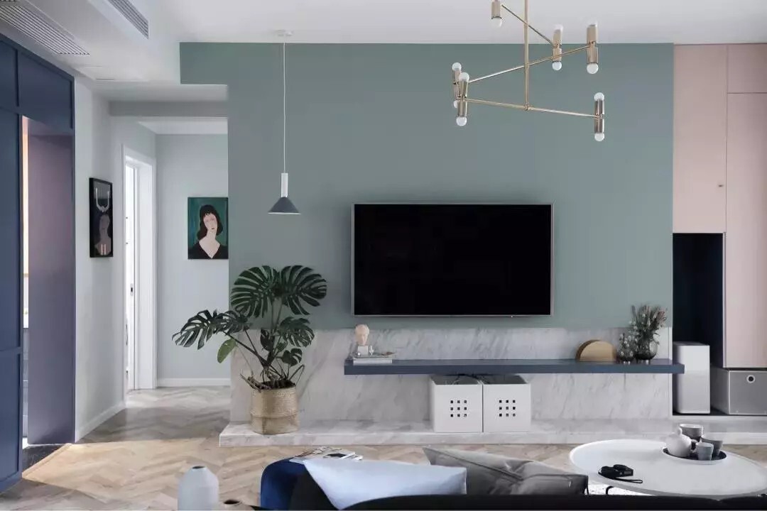 下方大理石,上方灰蓝色电视背景墙,使整个空间得到延伸。