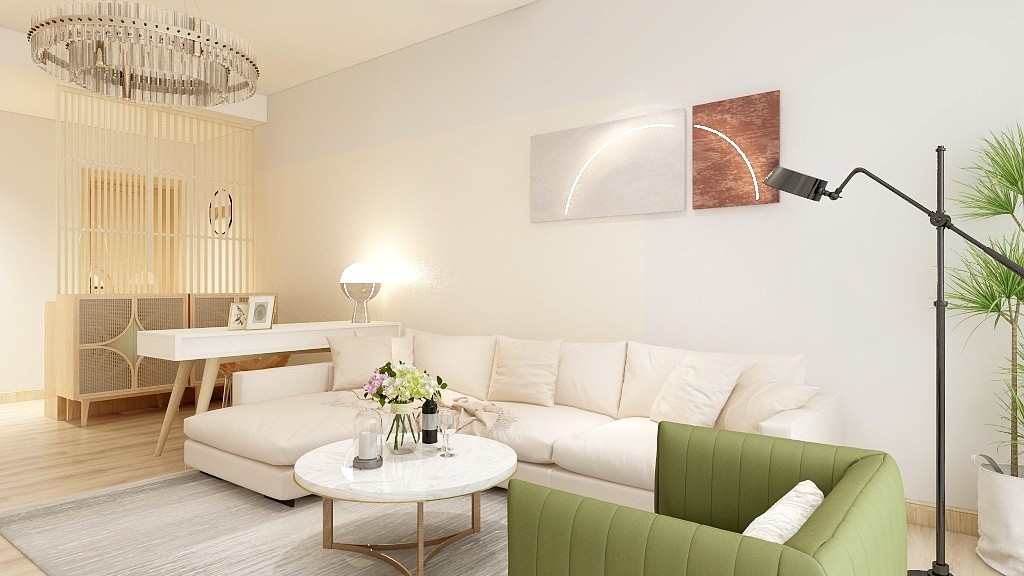 软装上建议使用原木色、米色,可少数使用跳跃的色彩进行空间的点缀提亮。
