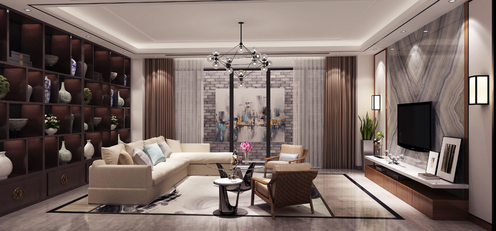 客厅在沙发后面设计了一面展示柜,用来放置屋主的收纳品,大气极了。