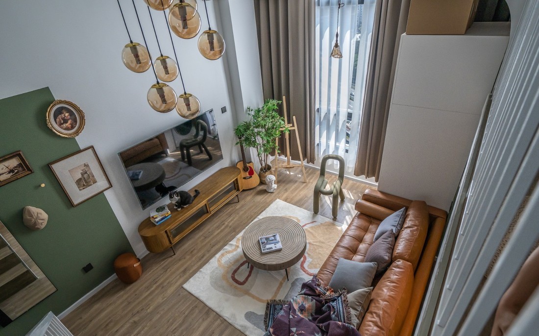 挑高的客厅光线充足,整屋通透明亮;没有多余的装饰点缀,精挑细选下的都是实用又美观的家具。