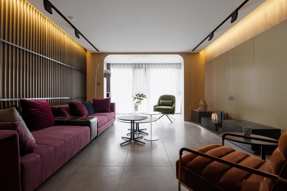 屋主是一对非常个性的90后夫妇,喜好的风格不同,对生活质量要求很高,追求一种更高的居住格调和生活品质,两人都偏向于富有格调的优雅气质得轻奢风格又想要突出个性。 设计师将二人想法融合,整体风格以轻奢混搭为出发点,用木饰面、格栅、大理石和艺术漆等不同材质不同材质和配色在空间内碰撞,反差却又契合,有一种迷人的魅力。同时利用墙体和隔断优化了整体空间布局,活跃了空间也加强了空间的功能性。