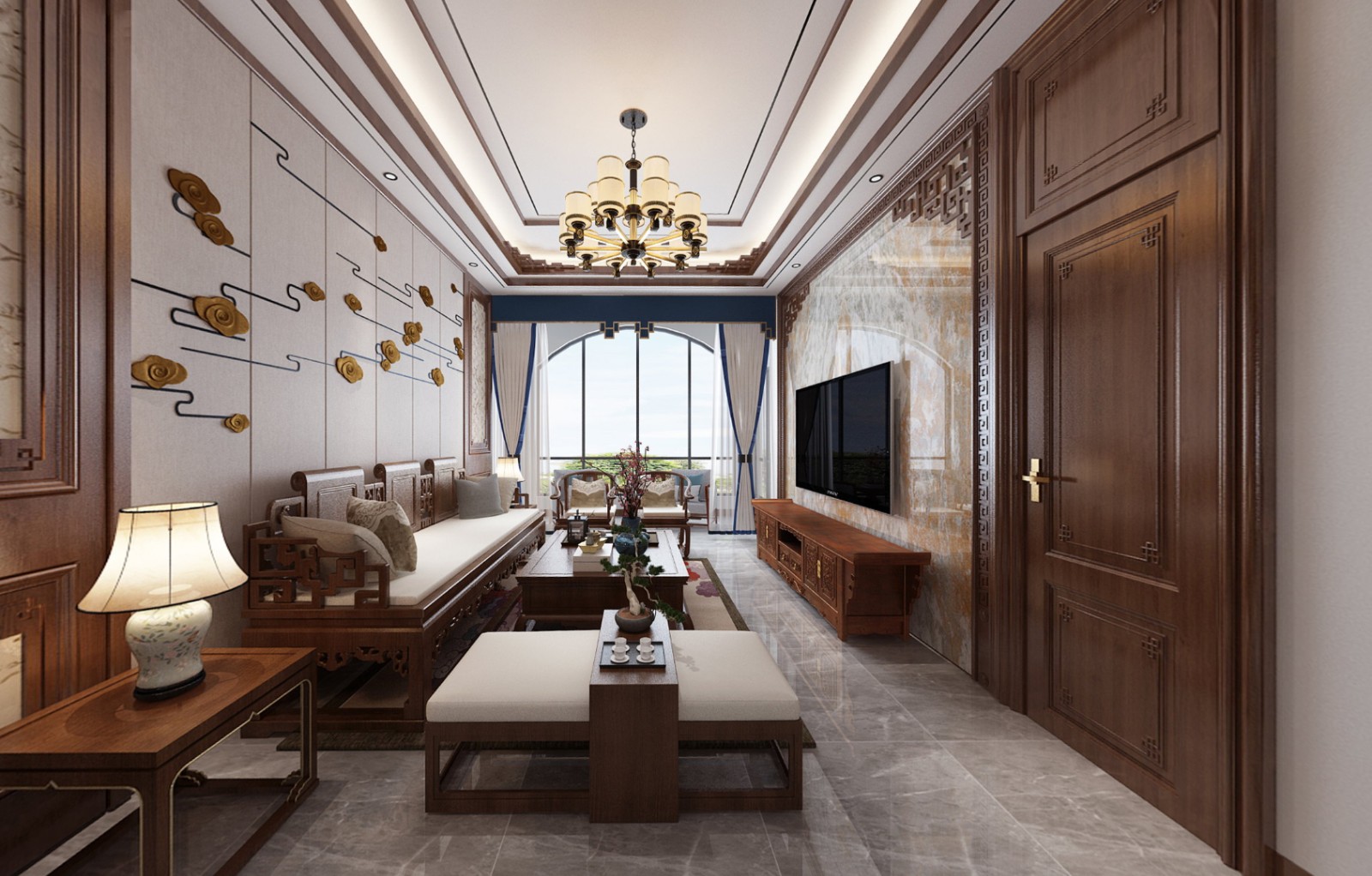 以古典木雕家具及门框雅艺作为点缀,古韵芳华之境,简约的笔触之中,处处蕴含大气的美。