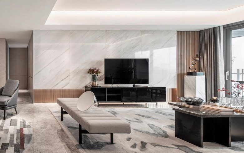 步入空间,玄关的装饰设计首先体现了这点。木栅格遮而不拦,反而透露出透叠的视觉效果,让人提起对背后景致的兴趣,相当巧妙。
