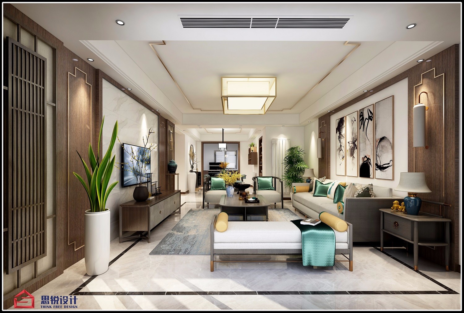 魅力简约线条的新中式家具与定制意象墙画,皆为理性雅致的空间增添了几分艺术的从容。整个空间清晰明亮素雅。