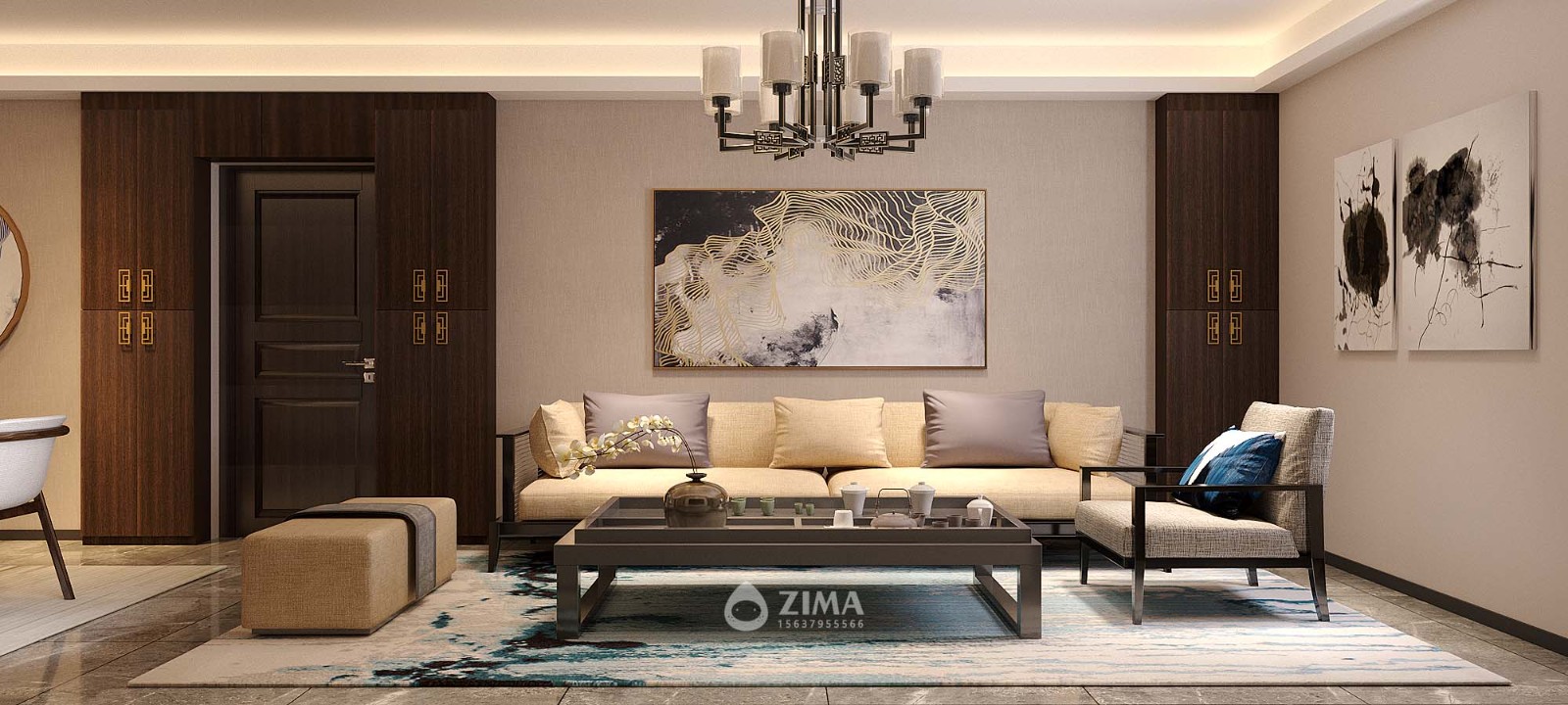 客厅:中式风格的古色古香与现代风格的简单素雅自然衔接,使生活的实用性和对传统文化的追求同时得到了满足。