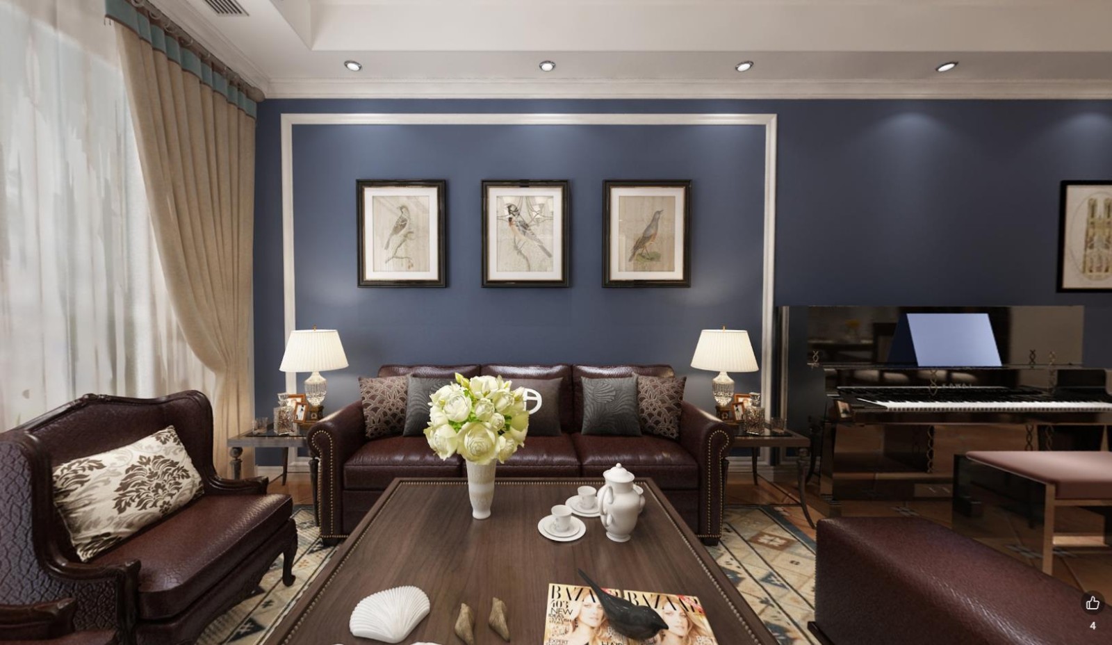 沉稳内敛的灰蓝色沙发背景墙面,搭配上深色系皮质沙发,边几上精致的台灯悄然呼应了沙发和单椅的色彩,经过后期的搭配,客厅显得尤为成熟稳重又休闲雅致。