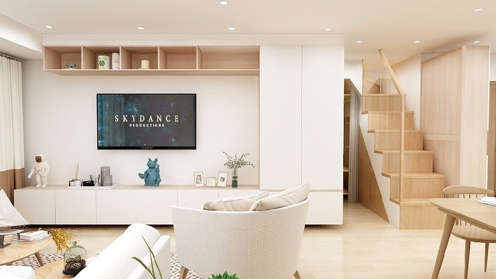 电视背景墙做半开放式柜,增加储物的同时,空间视觉感也比较好。