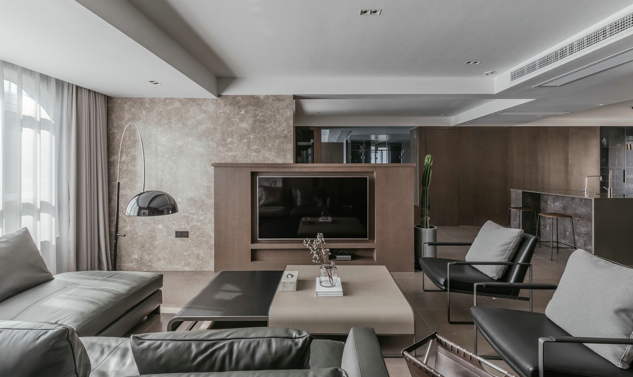 整体空间以大地色为主,混搭泥土色皮质沙发,搭配金属质感的钓鱼灯。