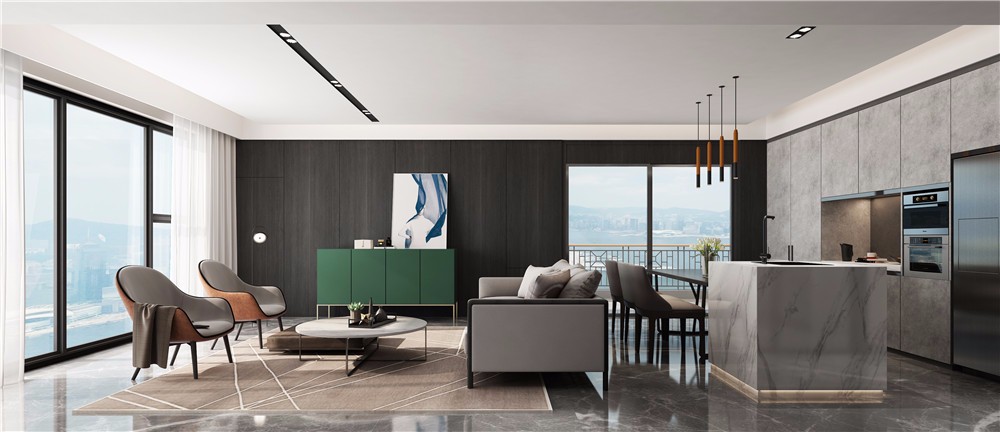 在设计上主要通过材质和色调来营造一个时尚简洁舒适的居家氛围。