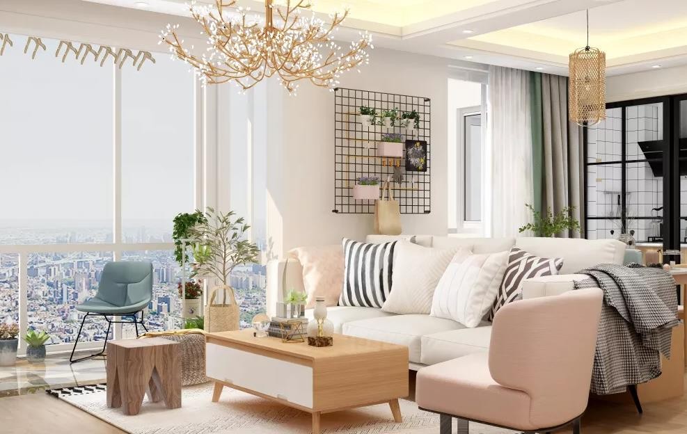 客厅采用北欧原木混搭风格,简约的吊灯、偌大的落地窗,色彩整体为暖色,整体色调温馨舒适。