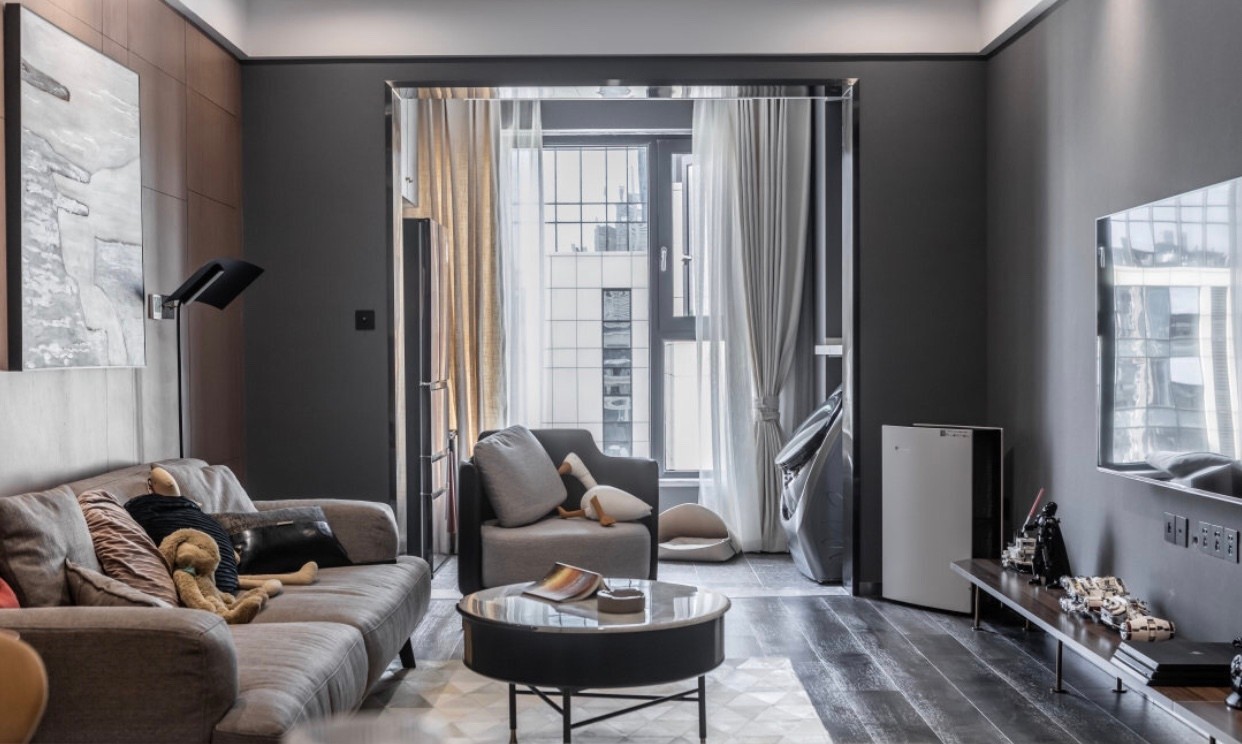 此案业主是作为过渡房来使用,房子平常就两人居住,衣服鞋子较多,需要尽可能多的空间来储物。整体设计概念,结合业主爱好,我们以深色为主体, 材质上运用了大面积的木元素,点缀了部分金属及石材等元素,以求自然平和却不失精致的居住感受。